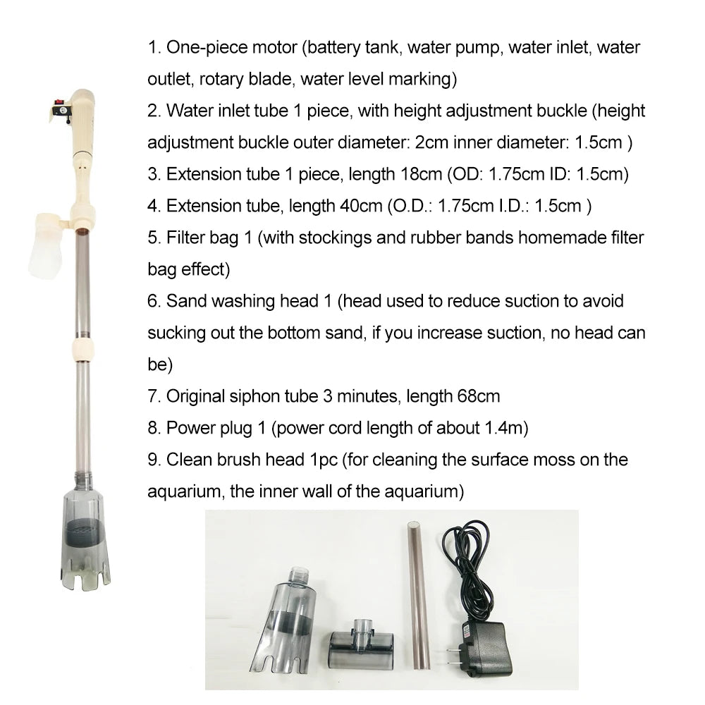 Tubo extensible: El cambiador de agua incluye un tubo extensible que se puede ajustar según sus necesidades. Dependiendo del tamaño y la profundidad del acuario, puede ajustar la longitud del cambiador de agua utilizando diferentes tubos de extensión de succión.